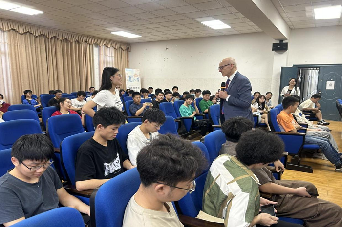 座谈会后,在与学生的见面会上,Dyce Davidson教授介绍了邓迪大学基本办学情况,详细介绍了邓迪大学在自然科学、工程技术、医工结合研究特点、办学优势以及两校的合作项目,并与学生进行了愉快地交流互动。