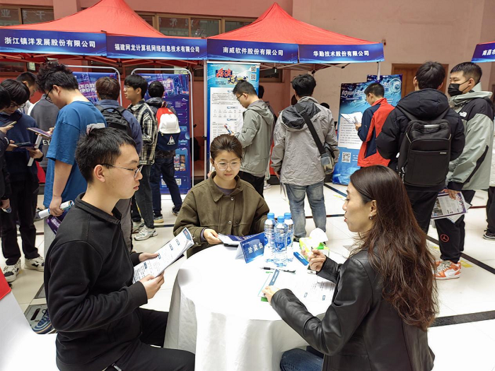 此次双选会是学院结合自身计算机大类学科专业毕业生就业规模、就业特点和就业意向专门组织举办的“小而精、专而优”的专场招聘会。通过企业自主报名、学院邀请等方式,依据用人单位岗位需求与双选会主题进行精准匹配,从众多报名企业中遴选出国药控股广州有限公司、国网江西省电力公司、上海高性能集成电路设计中心、北京安普诺信息技术有限公司、北京宇信科技集团股份有限公司、江西省网络安全研究院等32家用人单位,涉及软件工程、信息安全、网络空间安全等专业。双选会现场气氛热烈、秩序井然,毕业生根据自己的专业和求职意愿,与心仪企业的招聘人员交流、投递简历。初步统计,现场投递简历近500份,50余人进入下午面试环节,达成就业意愿的毕业生将陆续与用人单位进行签约。