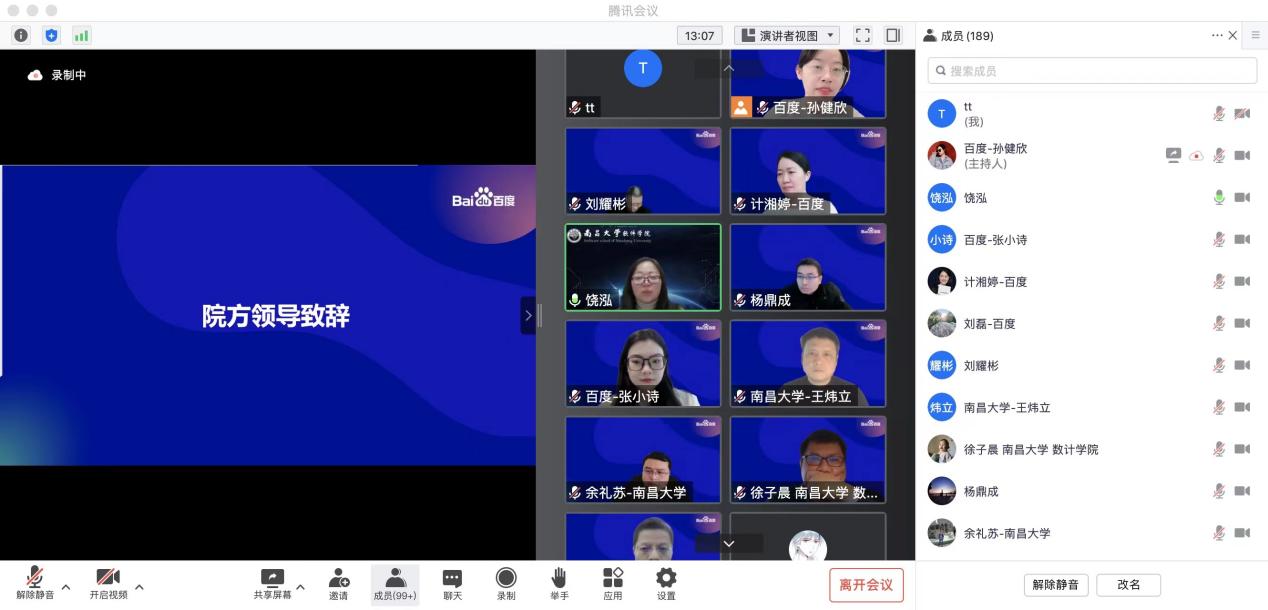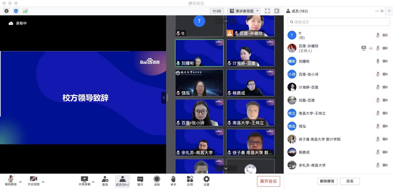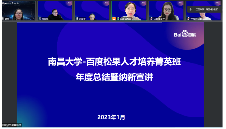 2023年1月4日下午,南昌大学联合百度通过线上方式举行了松果菁英班结课纳新仪式。截止目前,南昌大学百度松果菁英班项目已正式运行一年。在这一年里,来自于软件学院、信息工程学院、人工智能学院、机电学院、际銮书院、第二临床医学院的142名同学紧紧跟随松果菁英班的安排,在人工智能产业课程、职场胜任力课程、在线编程比赛中,借助跨学科交叉创新实践平台,通过理论与实践的紧密结合,以真实案例培养学生求职就业能力。