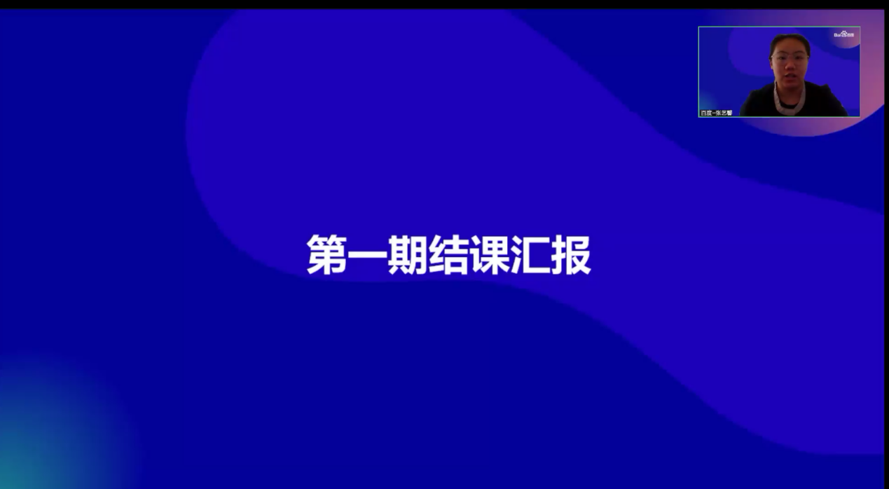 百度高校合作部张艺馨对第一期南昌大学百度松果菁英班运行情况和结课情况进行了汇报和总结,详细回顾了班级情况、人工智能产业课程、在线编程比赛、职场胜任力课程等环节。
