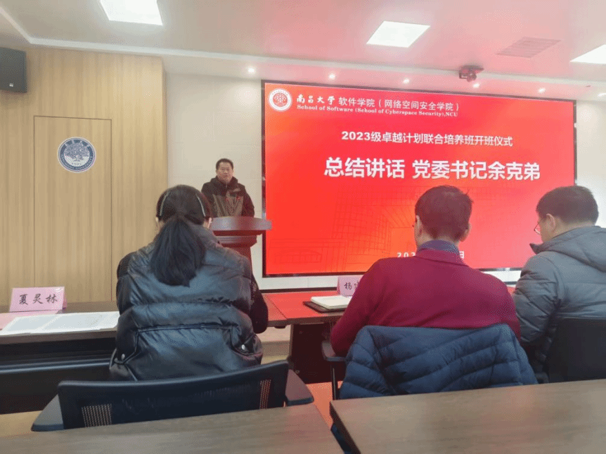 1月8日上午,南昌大学软件学院2023级卓越计划联合培养班开班仪式在软件楼401会议室举行。学院党委书记余克弟、党委副书记赵培培、副院长夏灵林、党委委员梅纲、软件工程系副主任魏勍颋、网络空间安全系副主任赵志宾以及2023级辅导员、相关部门负责人出席仪式。仪式由夏灵林副院长主持。