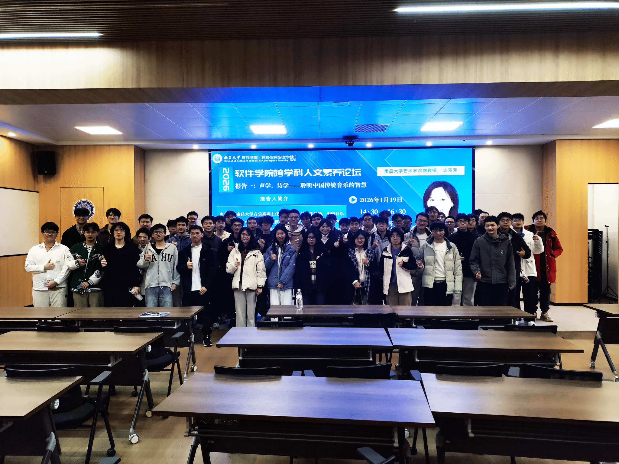 1月19日,软件学院在软件楼401报告厅举办首场跨学科人文素养论坛,主题为《声学·诗学——聆听中国传统音乐的智慧》。讲座由艺术学院音乐系副主任、副教授史芳芳主讲,软件学院党委委员、副院长邹艳妮主持,近百名学生参加。