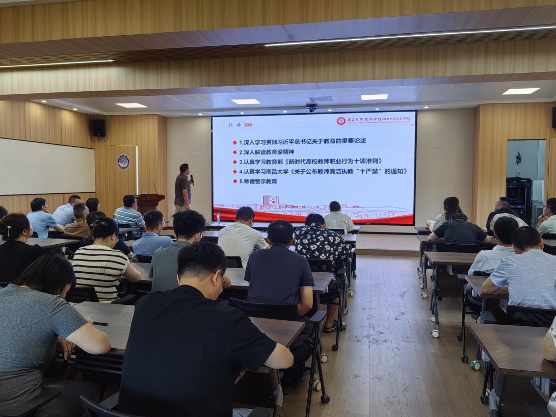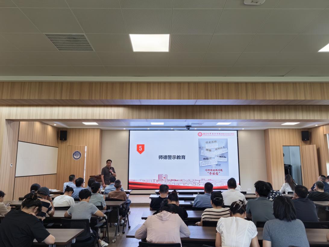 9月16日,学院召开教职工大会,党委书记余克弟讲授“师德师风开学第一课”,带头宣讲习近平总书记关于教育的重要论述,深入解读教育家精神、新时代高校教师职业行为十项准则等师德建设相关制度文件,并穿插开展正面师德典型教育和师德警示教育,组织教职工集中观看《北京理工大学陶然:春风化雨三十载 矢志初心育英才》和《南昌大学杨柏云:大力弘扬兰花精神 牢固树立廉洁观念》,通报十类师德违规警示案例,促进教职工学思践悟,提高践行教育家精神的自觉性和主动性,将弘扬教育家精神与加强新时代高素质专业化教师队伍建设紧密结合起来,以实际行动推动教育家精神落地生根。