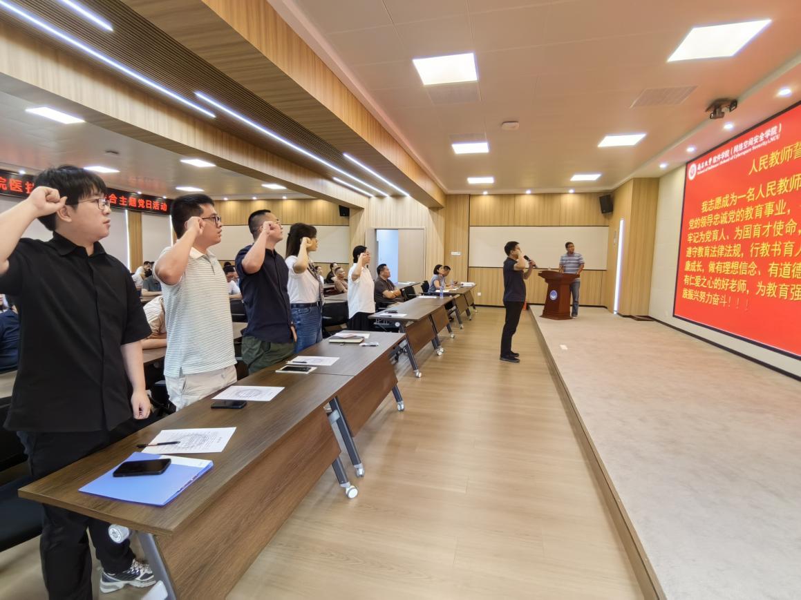 同时,为激励新入职教职工躬耕教坛、担当作为,学院开展新入职教师宣誓并签订师德承诺书活动。5名新进教师在2025年南昌大学优秀共产党员、学院“双带头人”教师党支部书记邵国林带领下、在全院教职工的见证下进行集体宣誓,并签订师德承诺书。