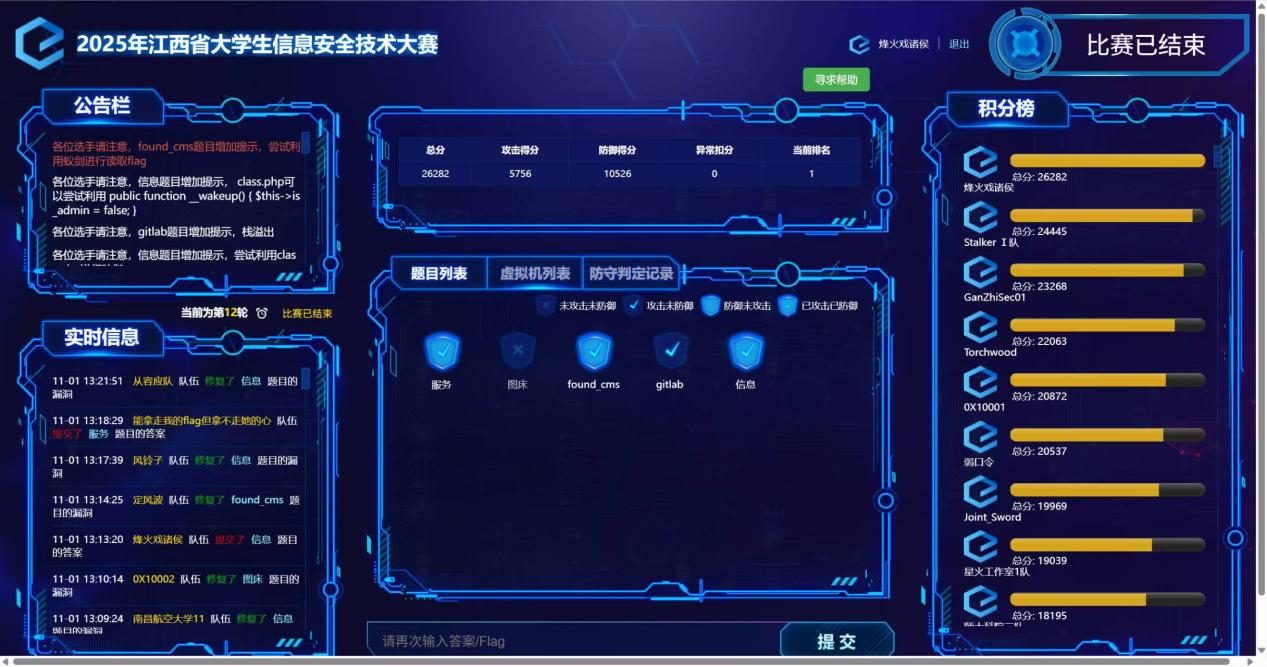 赛事吸引了来自南昌大学、江西财经大学、南昌航空大学、江西理工大学等49所高校的535支队伍参与线上预赛。经过激烈角逐,来自46所高校的79支队伍闯入现场决赛,在无形的网络空间中展开了一场没有硝烟的“攻防之战”。面对强敌环伺,战队成员沉着应战,策略精准,攻防兼备,最终以碾压之势锁定胜局,赢得冠军。