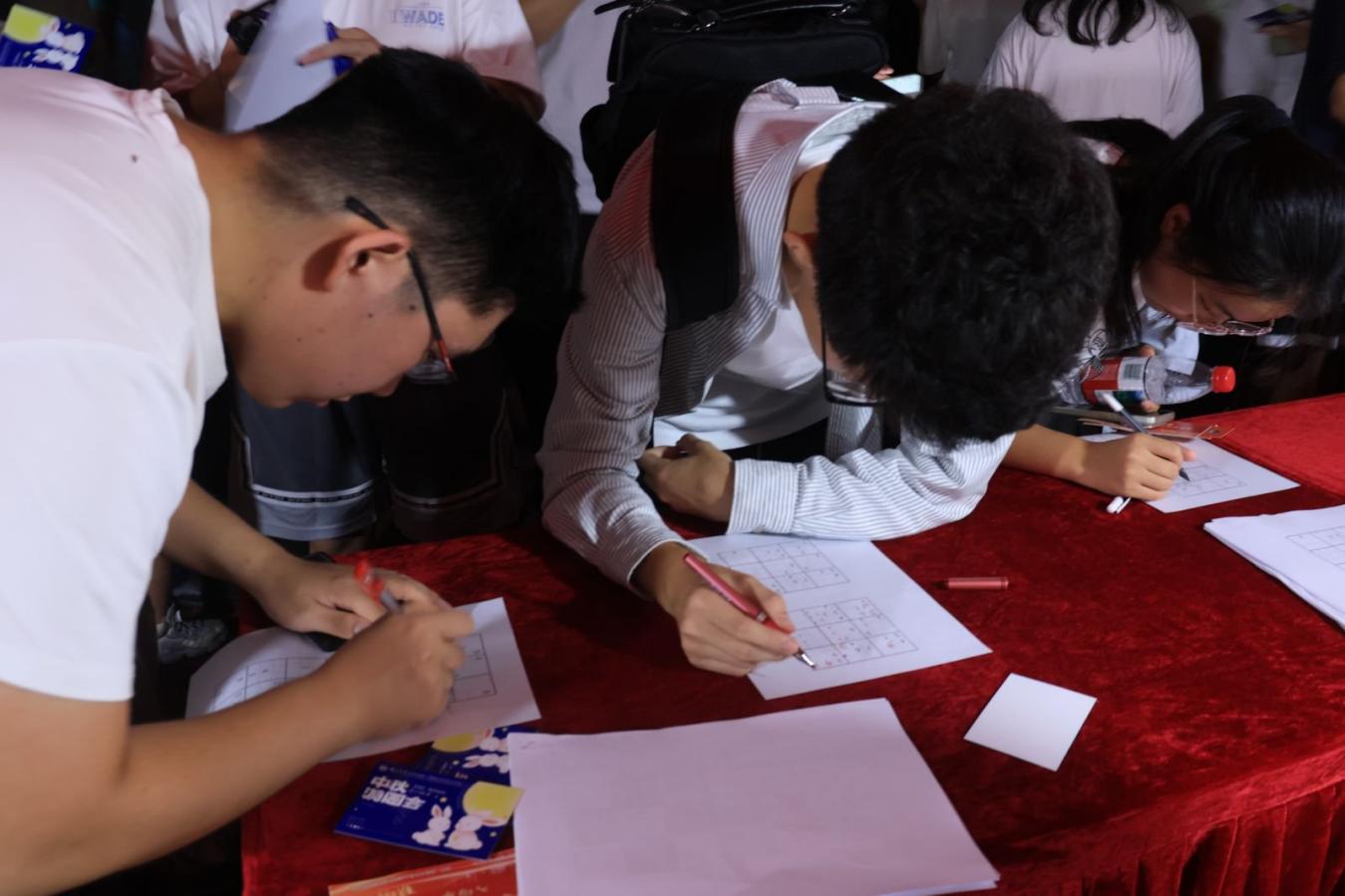 游园会现场设置六大主题摊位,将知识性、趣味性与文化性深度融合。“玉轮滚滚”“玉兔跳一跳”“玉兔吃月饼”游戏项目,不仅考验了参与者的协调性和平衡感,还让大家在欢声笑语中感受到了传统文化的魅力;“数独游戏”与“解密编码”摊位前,参与者沉浸于逻辑推理的乐趣,感受数字与符号的魅力;“听音识曲”环节以经典旋律唤起集体记忆,现场不时响起掌声与欢呼;“吹球过河”则通过趣味运动考验团队协作,欢声笑语此起彼伏。“言正行反”通过反向指令完成动作,幽默的肢体语言与敏捷的反应力引发阵阵笑声。“猜灯谜”还将网络安全知识、反诈知识融入趣味活动之中,给师生带来了别开生面的活动体验。游园会中,师生们可凭盖有印章的集章卡领取“锦鲤创意书签”“嫦娥奔月钥匙扣”以及“月兔挂件”等富含中秋传统文化元素的文创产品。
