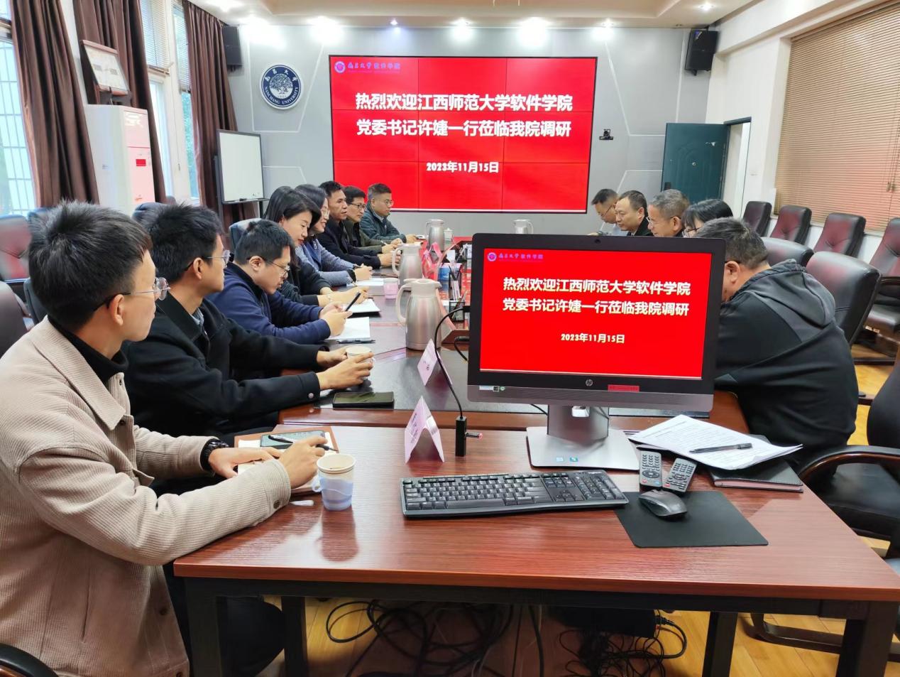 11月15日下午,江西师范大学软件学院党委书记许婕一行来我院调研交流,学院党委书记艾淑平、党委副书记江婕、副院长黎华以及部分党支部书记参加了座谈。