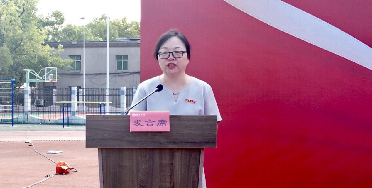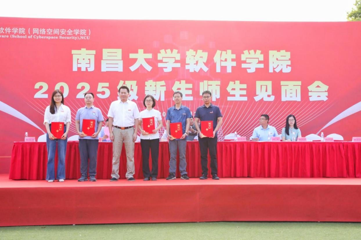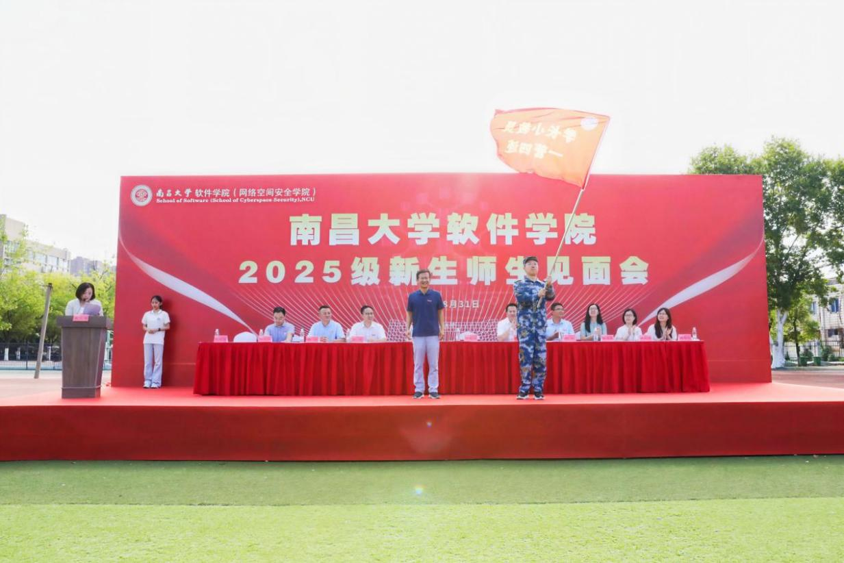 饶泓代表学院对2025级新生表示热烈欢迎,并向新生解读了“大学之道”和南昌大学校训的含义,希望新同学以思辨之眼识智能挑战,以笃行之力筑未来之基,以家国之怀赴时代之约。她勉励新同学将个人理想融入国家发展,在智能浪潮中不迷失方向,以格物致新之智,铸数字文明之基。余克弟代表学院为2025年“南新之友”代表颁发聘书,谈振兴代表学校为学长小教员授旗。