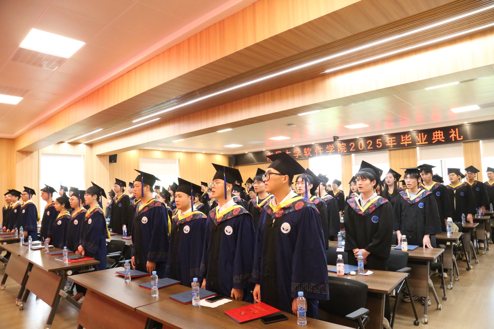 毕业典礼在庄严的国歌声中拉开序幕。党委委员、副院长邹艳妮宣读《关于2025届毕业生准予毕业和授予学位的决定》《关于表彰2025届优秀毕业生的决定》《软件学院2025届毕业生赴西部、基层就业名单》。本科生毕业生代表叶俊君、研究生毕业生代表汪栋、教师代表赵志宾依次作了发言。
