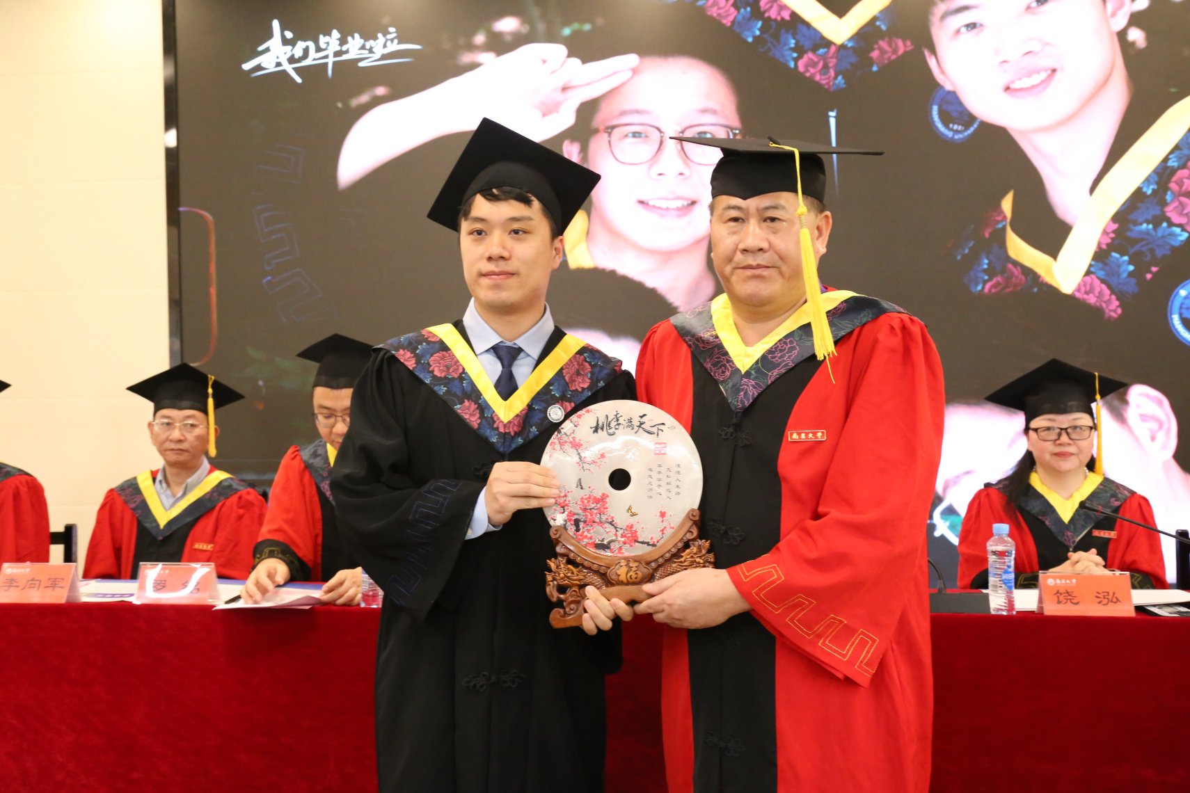 随后,院党委书记余克弟与毕业生代表上台互赠纪念品。