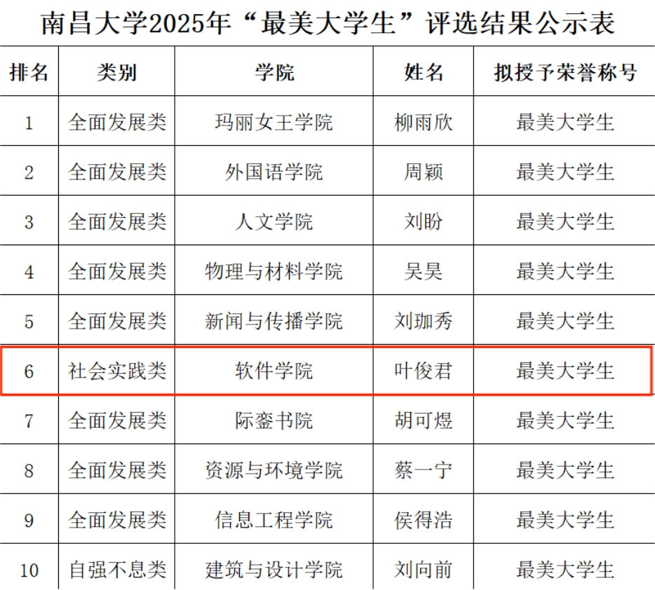 近日,南昌大学2025年"最美大学生"评选结果揭晓。经过学院推荐、社区展示、网络投票、材料评审及现场答辩等环节的激烈角逐,软件学院叶俊君同学以总分第六名的优异成绩脱颖而出,荣获该项称号。