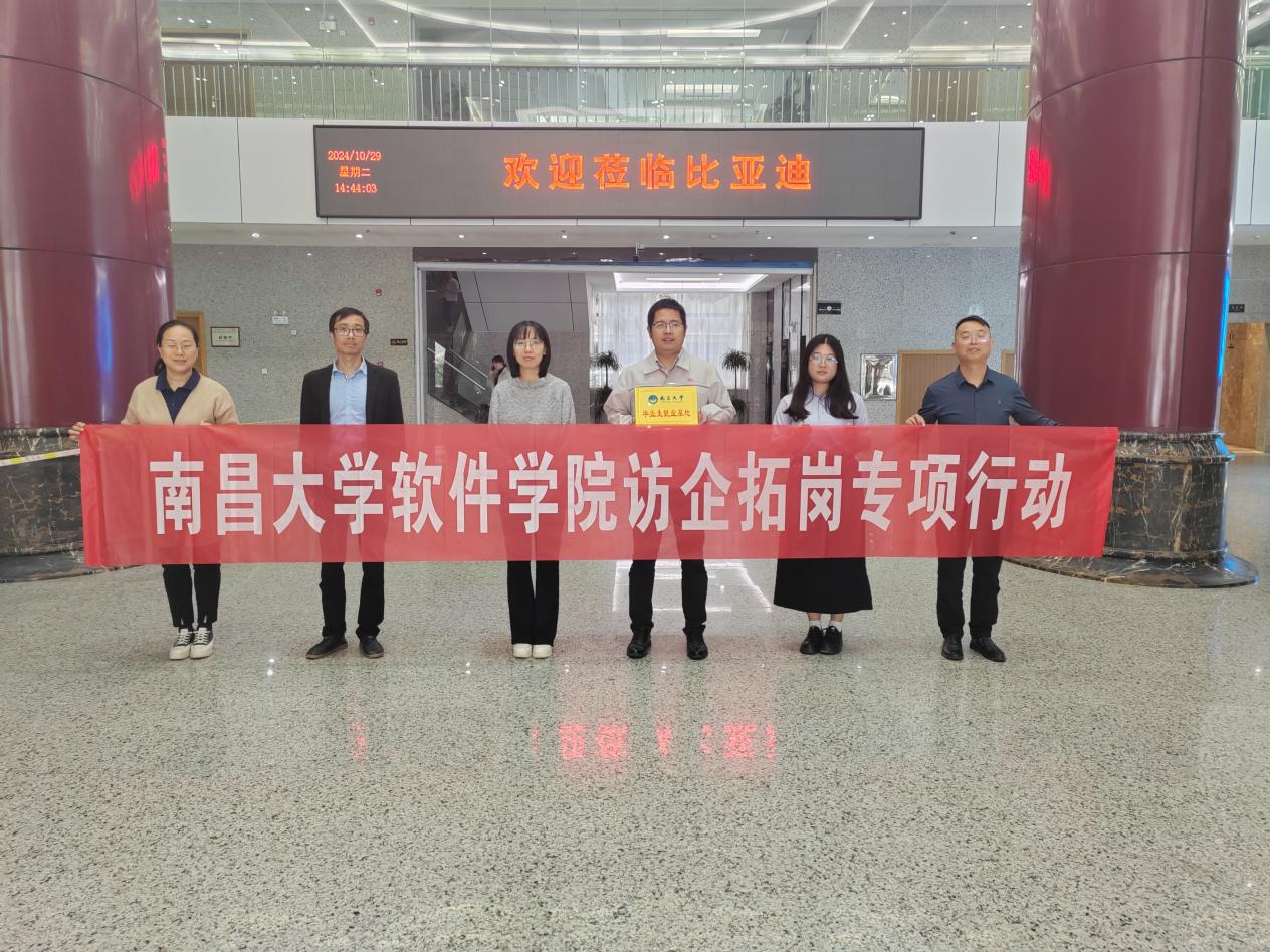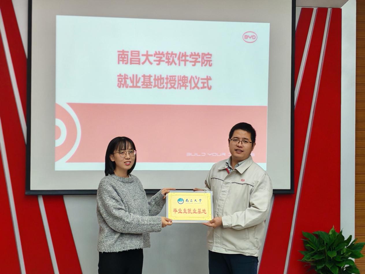 蒋平从企业的发展概况、企业架构到新入职员工的职业发展路径、各岗位所需专业技能、企业校友情况、本年度签约情况等方面进行了全面且有深度的讲解,指出双方自2021年就建立了长期稳定的人才输送渠道,学院2023、2024届毕业生为公司输送人才均20余人次,2025届毕业生已完成17人次签约。希望校企双方能够以此为基础,进一步加强产学研人才培养等方面的合作,充分发挥各自优势,实现优势互补、互惠共赢。江婕首先感谢比亚迪公司对我院毕业生的认可和学院就业工作的大力支持,介绍了学院2025届毕业生就业情况并邀请企业参与到学院秋季双选会。她表示,希望校企双方能够依托区域优势,进一步加强校企合作和就业基地建设,共同开创软件学院与比亚迪合作的美好未来。夏灵林介绍了学院卓越工程师和本科人才培养方案,并就双方在课程建设、产业班培养、就业实习以及产学研合作等方面进一步深化合作提出了新期望。座谈会还举行了南昌大学就业基地授牌仪式。