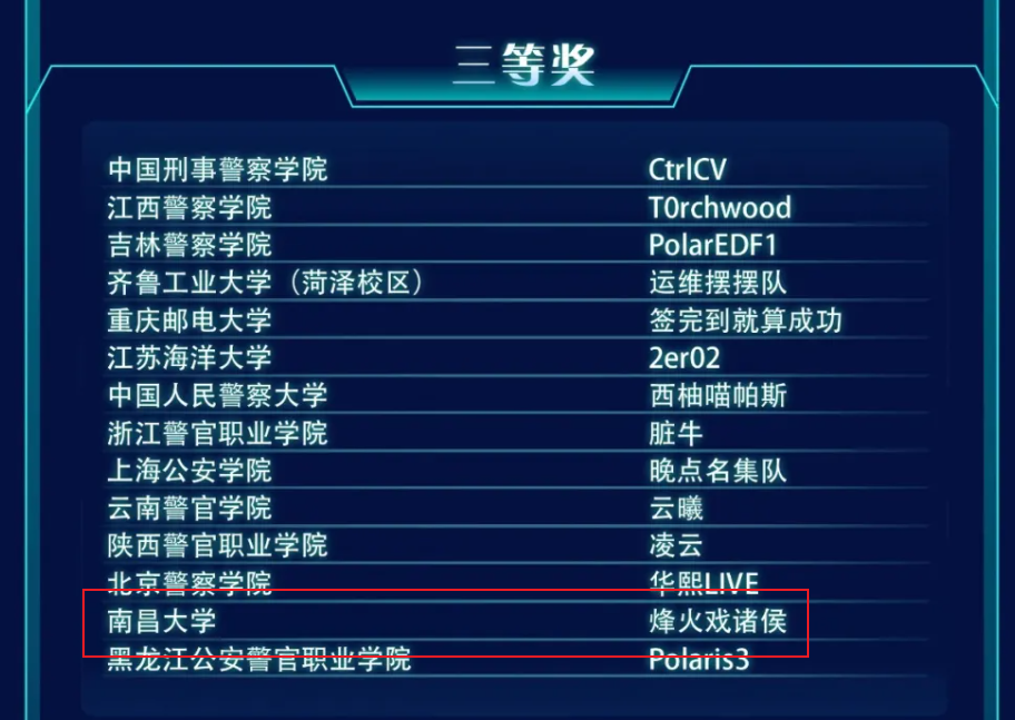 在激烈的线上晋级赛中,烽火信息安全社团的五支队伍在指导老师万欣的带领下表现出色,全部获得奖项名次,共斩获学生组一个一等奖、两个二等奖和两个三等奖。其中,获得一等奖的“烽火戏诸侯队”由管延浩、廖超、刘绮玥组成,他们以卓越的技术实力和出色的竞赛策略,成功晋级线下总决赛。