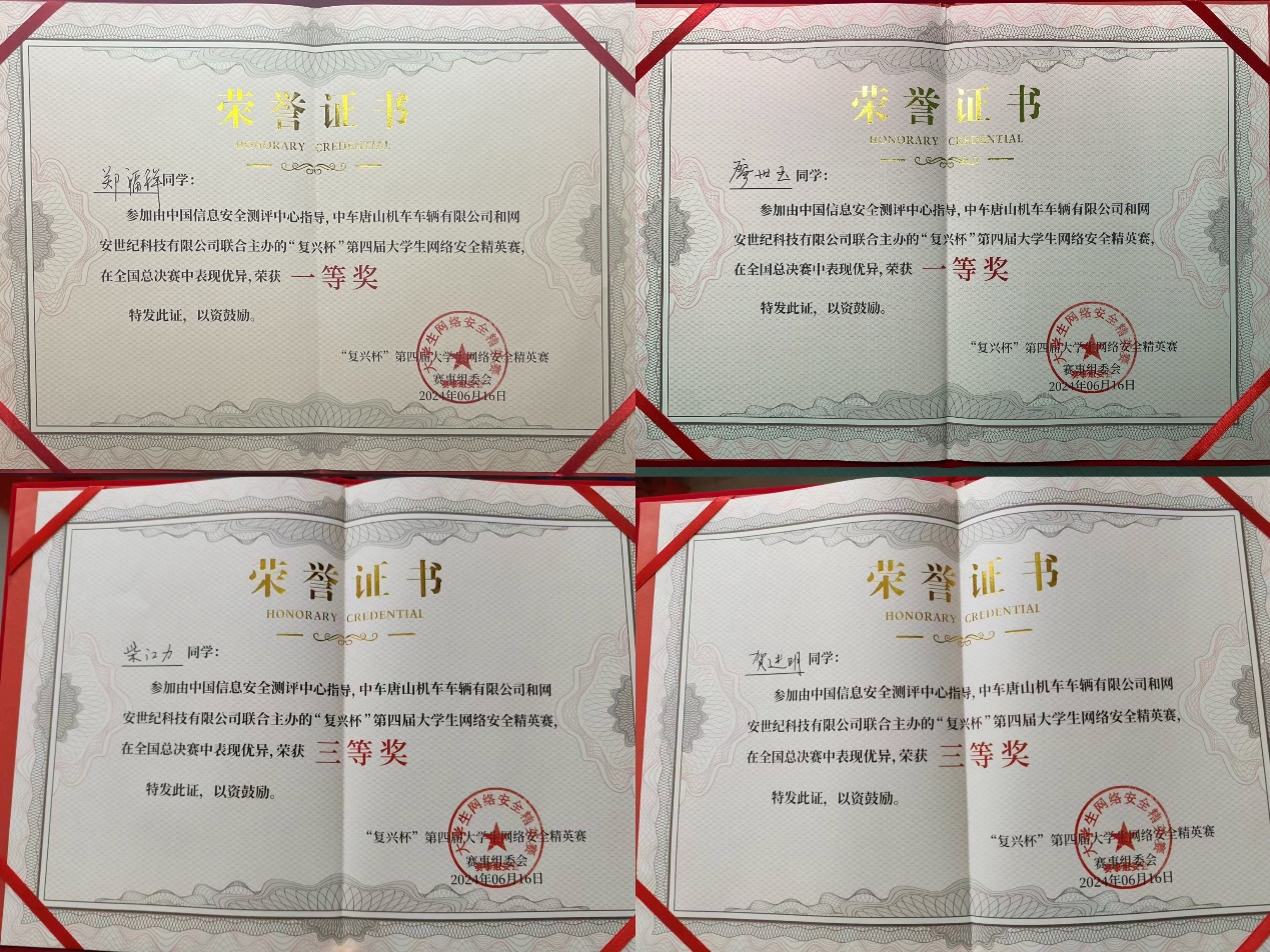 6月16日,由中国信息安全测评中心指导的“复兴杯”第四届大学生网络安全精英赛总决赛及颁奖典礼,在唐山丰润数字创新示范产业园成功举办。本届精英赛历时7个多月,来自全国2460所高校70051名选手踊跃参赛,经过初赛、复赛和排位赛的激烈角逐,共有100名精英选手脱颖而出,成功晋级总决赛展开巅峰对决,最终决出特等奖1名、一等奖5名、二等奖10名、三等奖20名、优秀奖64名。我校软件学院和数学与计算机学院学子郑福祥、廖世玉荣获总决赛一等奖,柴江力、贺述明荣获总决赛三等奖。