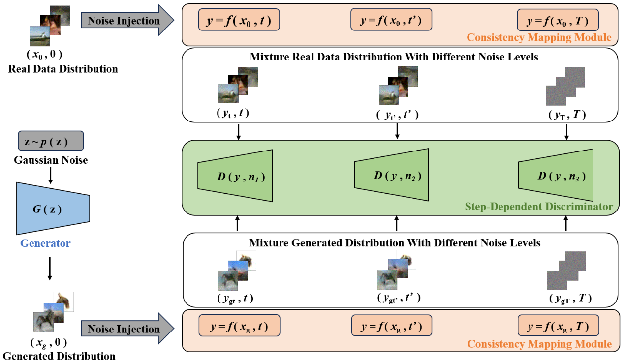 该论文聚焦生成式学习任务的模型性能问题,首次提出了使用一致性映射模块稳定对抗训练过程的方法。一致性映射模块向样本中加入实例噪声在保证生成样本的多样性的同时,又能更好地避免模式崩溃,从而稳定对抗训练过程;该方法同时解决了用传统扩散模型做生成任务时采样速度较慢的问题,在保证样本质量的前提下降低了计算成本,提升模型收敛速度。