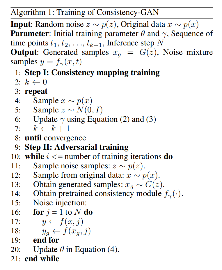 论文模型 Consistency-GAN 包含三个模块:(1) 用于将实例噪声混合进真实分布和生成分布的 Consistency Mapping 模块。(2) 用于输出生成分布的 generator 模块。(3) 可以根据噪声水平区分真实分布和生成分布的 discriminator 模块。引入Consistency Mapping 模块提供一种有效的方法,只需较少的几步(Number of Function Evaluation)即可通过一致性映射将实例噪声添加到 GAN 的真实分布和生成分布中。一致性映射模块是一个可以将概率流常微分方程(PF ODE)扩散轨迹上的点映射回原点的映射网络,通过它实现在原始数据分布和噪声扰动数据分布之间的可逆映射。这种点到点的映射网络能够极大的缩减通过迭代生成过程学习扩散轨迹所需的时间和计算成本。通过在训练 GAN 的生成器和判别器的过程中往原始数据和生成数据中加入噪声,同时允许根据映射步数动态调整噪声注入水平。算法流程如下: