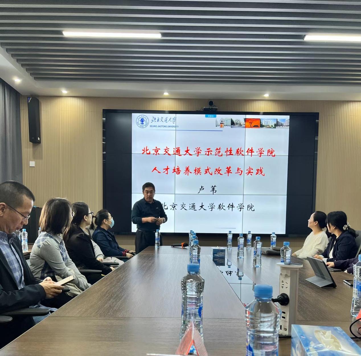 会上,卢苇教授介绍了北京交通大学软件学院人才培养模式改革与实践经验,指出应结合一流本科专业建设、工程教育专业认证要求,强化学生的工程实践能力培养,建设应对新技术、新模式、新业态的“精讲多练,突出特色”的理论课程体系、“多轮实训,螺旋提升”的实践课程体系、“价值导向,工程素养”的素质课程体系,培养高端软件人才。