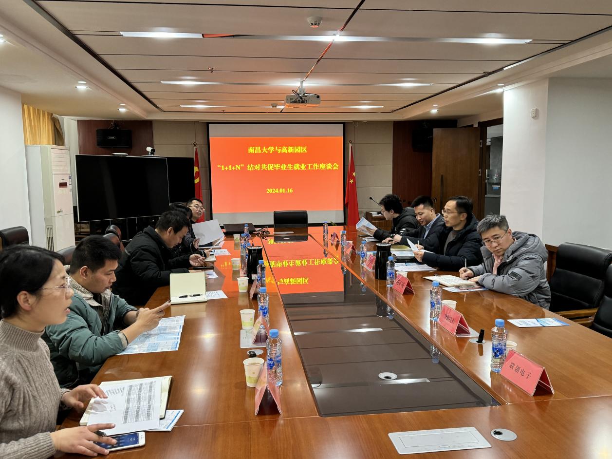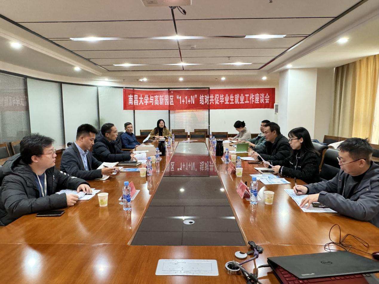 1月16日下午,南昌大学毕业生就业指导服务中心副主任杨加明、软件学院党委副书记江婕一行赴南昌高新区就业创业服务中心洽谈校地深入合作事宜。南昌高新区就业创业服务中心主任周小平、副主任胡正国以及双胞胎集团、联创集团、华勤集团、江西博微新技术等入驻园区内的知名企业人事高管出席座谈会。与会成员围绕“1+1+N”结对共促毕业生就业以及人才培养、产学研用深度融合等方面开展广泛交流。