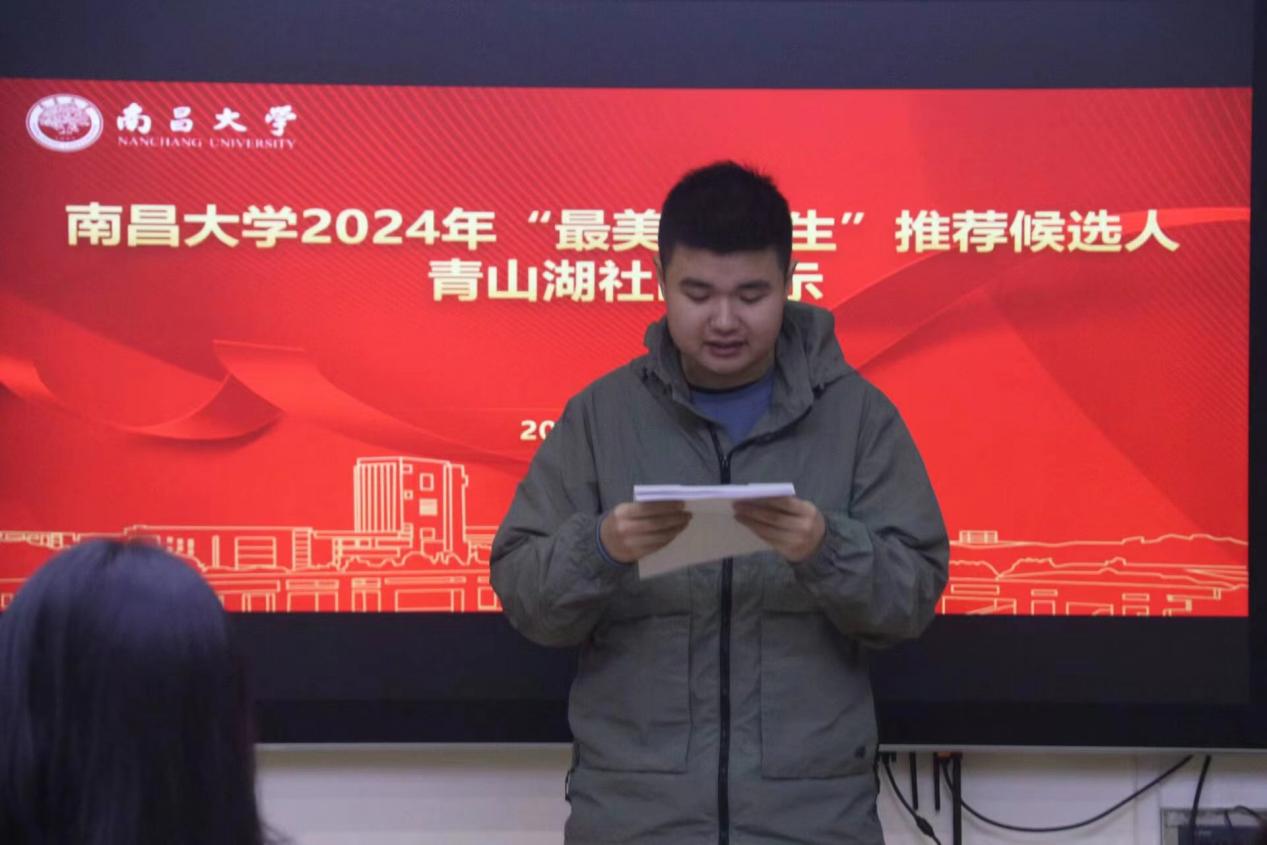 为进一步激发我院青年学子积极进取的热情,倡导“学习最美、弘扬最美、争当最美”的良好风尚,2024年3月15日晚7点,学院于软件楼232开展了南昌大学2024“最美大学生”候选人青山湖社区展示活动,学院师生共40余人到场观摩。
