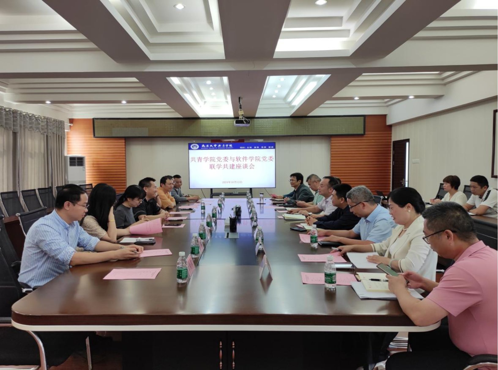 为深入学习贯彻党的二十届三中全会精神和全国教育大会精神,以高质量党建引领教育事业高质量发展,10月12日,软件学院党委与共青学院党委在共青学院举办以“联学共建聚合力,携手共进谋新篇”为主题的联学共建活动。软件学院党委书记余克弟,党委副书记、院长饶泓等全体党政班子成员,共青学院党政班子成员、相关系部教师代表共16人参加。本次活动由共青学院党委书记廖梦园主持。