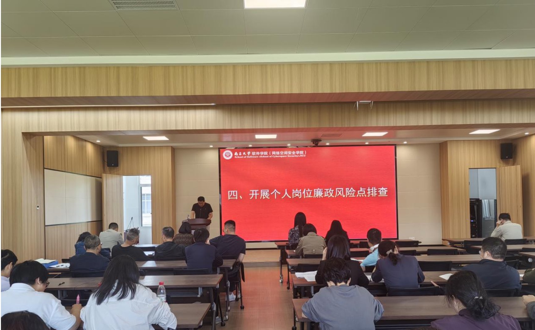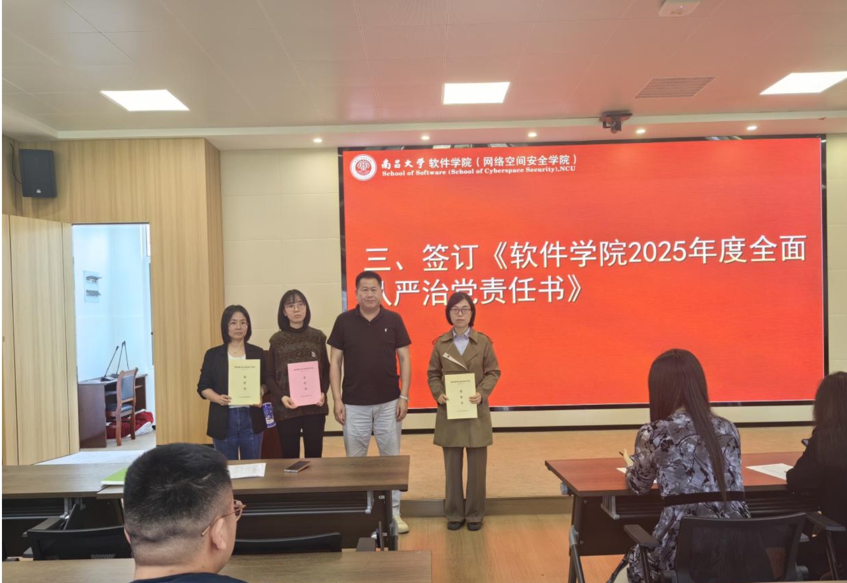 与会人员集体学习了二十届中央纪委四次全会精神、省纪委十五届五次全会精神和教育系统2025年全面从严治党工作视频会议精神,观看了警示教育专题片《铁规矩硬杠杠》,举行了《软件学院2025年度全面从严治党责任书》签订仪式,开展了个人岗位廉政风险点排查。