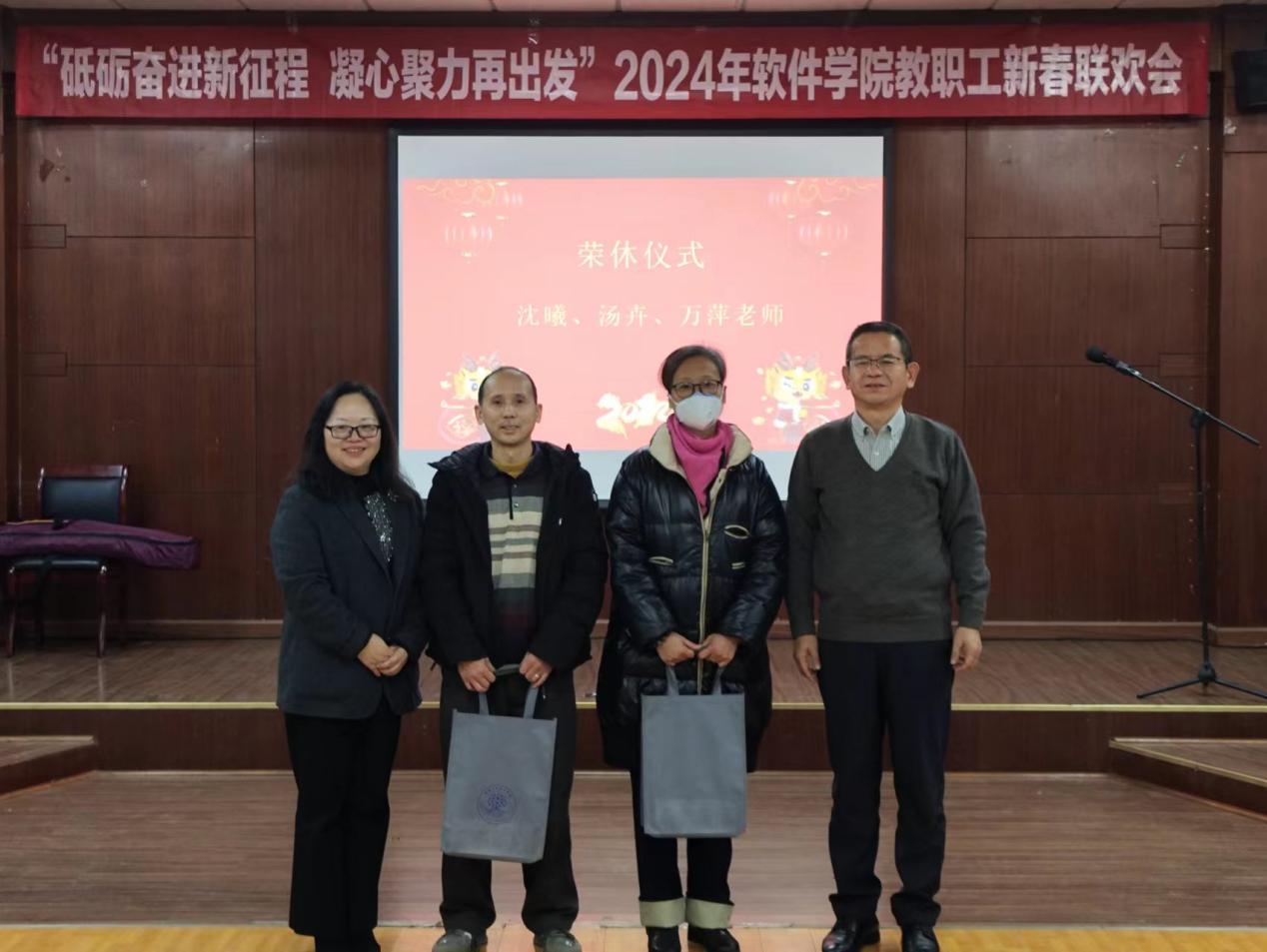 联欢会的歌曲、舞蹈、互动游戏、抽奖等精彩节目,多角度为教职工带来一场前所未有的视听盛宴。唱跳节目《爱你》拉开了联欢会序幕,热情四溢的音乐,动感十足的舞蹈,将整个会场点燃,让教工们沉浸在欢快的氛围中。古筝独奏《声声慢》《烟雨唱扬州》,远听婉转低沉的琴音,如天上之音,回响天际,近听似细雨打芭蕉,在耳畔呢喃。网络空间安全系全体教师的合唱《真心英雄》,展现了学院团结向前的精神风貌。三句半《新年笑哈哈》幽默搞笑,引得观众阵阵笑声,为联欢会增色不少。院办党务部门带来的《惊喜》,为当天生日的老师送上生日祝福。互动游戏“双人拾贝对抗赛”“抢水瓶大战”将现场的欢乐氛围带入了巅峰,教职工们尽情享受着这个欢乐时刻。学院还为今年退休的教职工举行了荣休仪式。联欢会在软件工程系全体教师合唱《明天会更好》的温馨感人氛围中落下帷幕,展现出软件学院教职工积极进取的良好精神面貌。活动最后,艾淑平书记、饶泓院长送上美好的新春祝福。