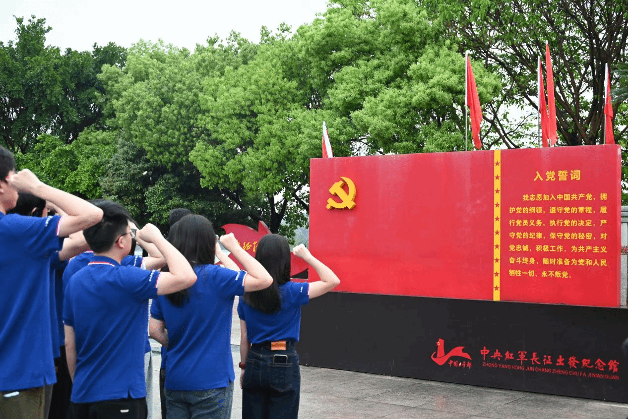 在中央红军长征出发地纪念园,全体党员面向党旗重温入党誓词,向革命先烈鞠躬致敬,表达传承红色基因的坚定决心。
